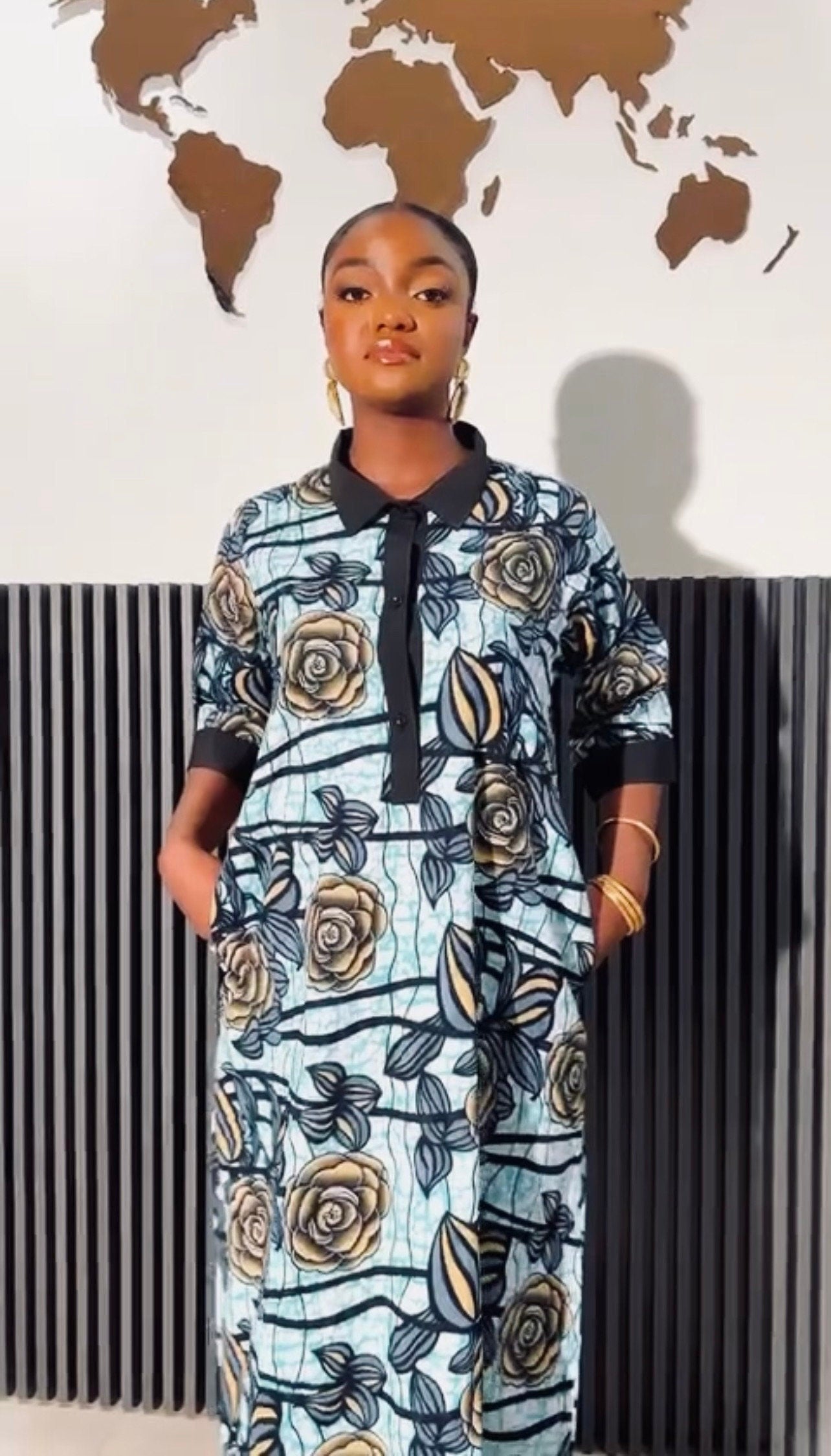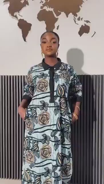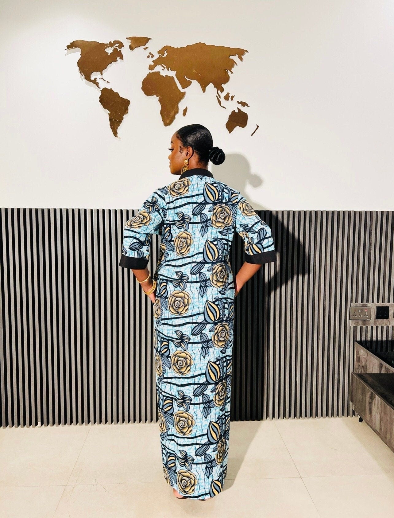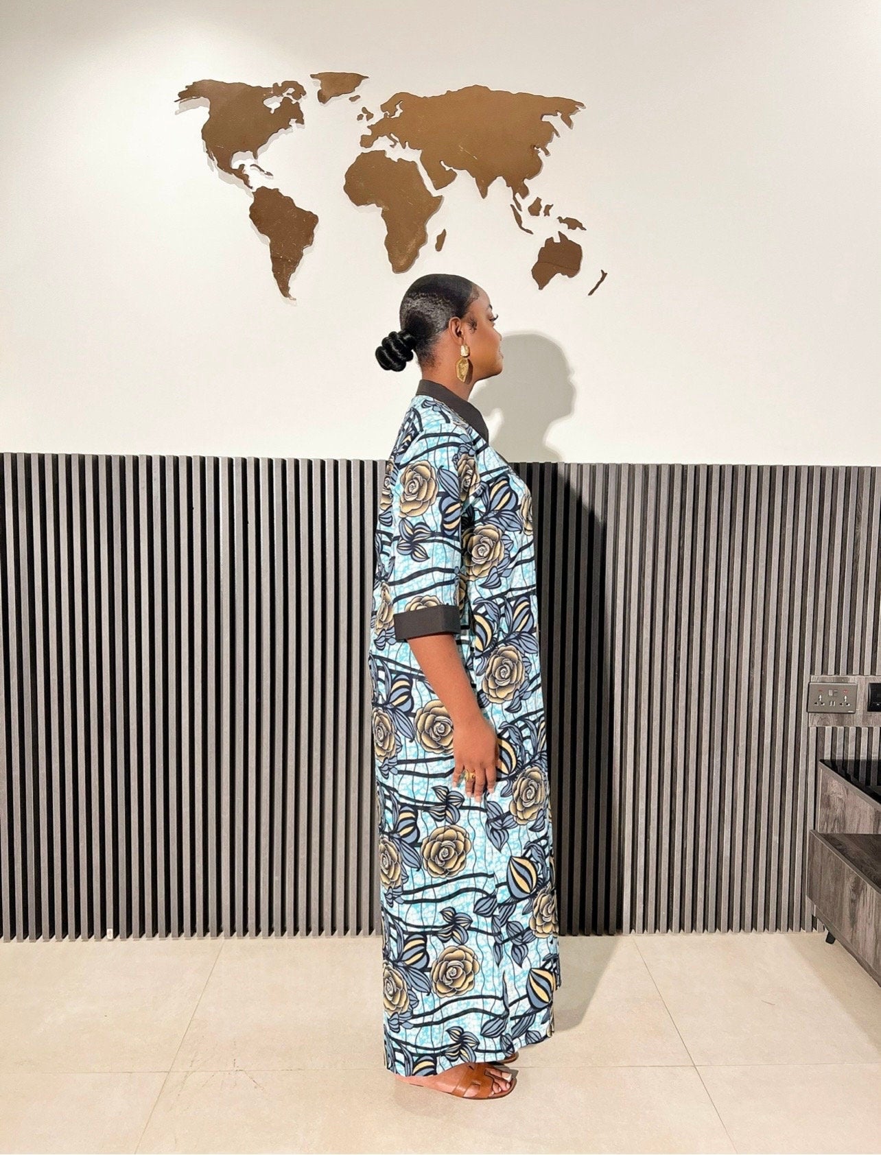 Our SAMIRA African Print Maxi Caftan Dress Is The Perfect Dress for Relaxation, Hosting, Beach Walks, And Any And All Effortless Dressing. A Unique And Beautiful Blue Ankara Floral Print That Will Flatter All Complexions. Casual, Comfortable, And Sure To Get You Lots Of Compliments.