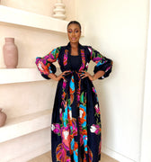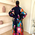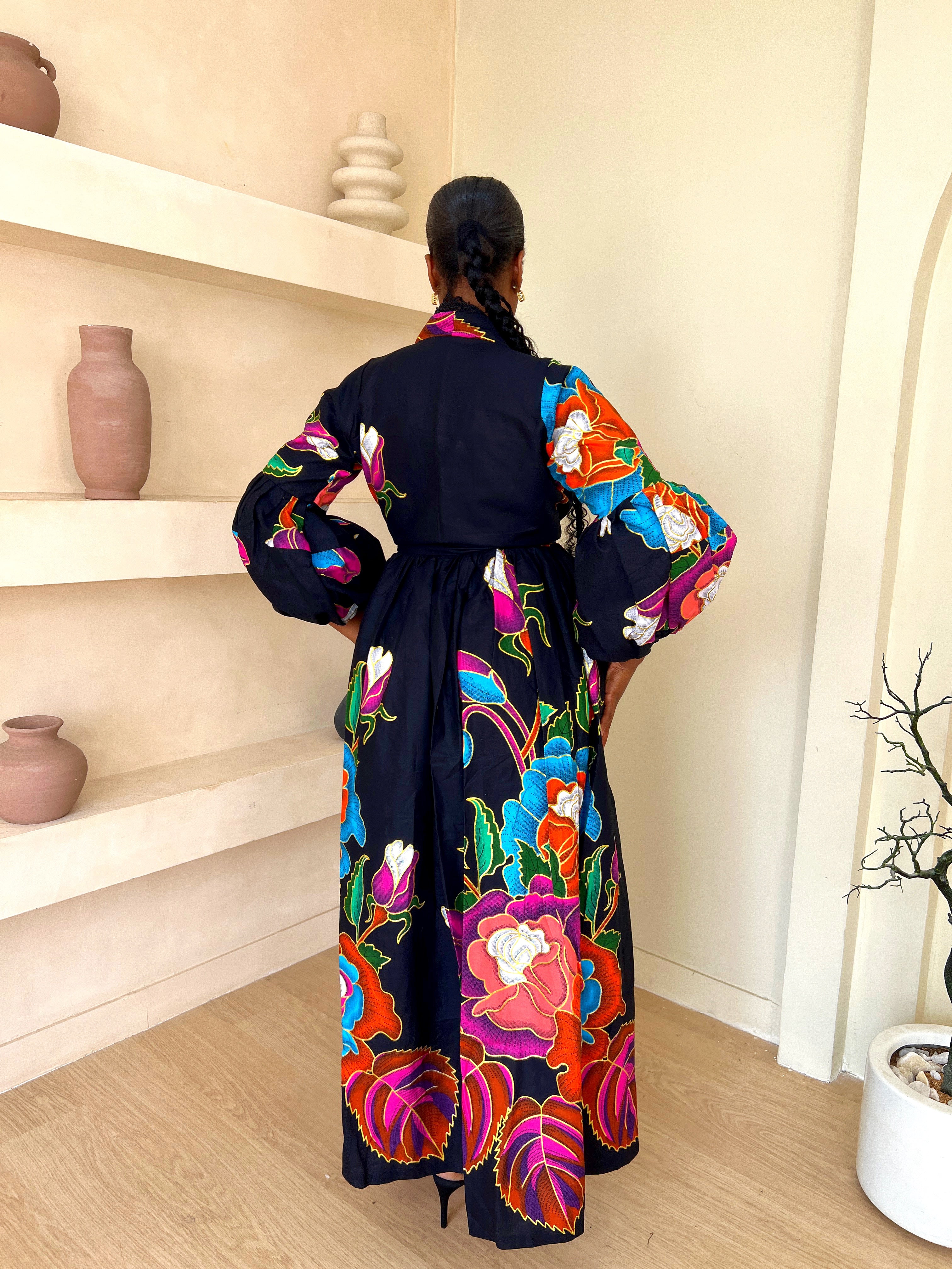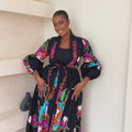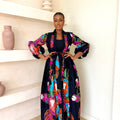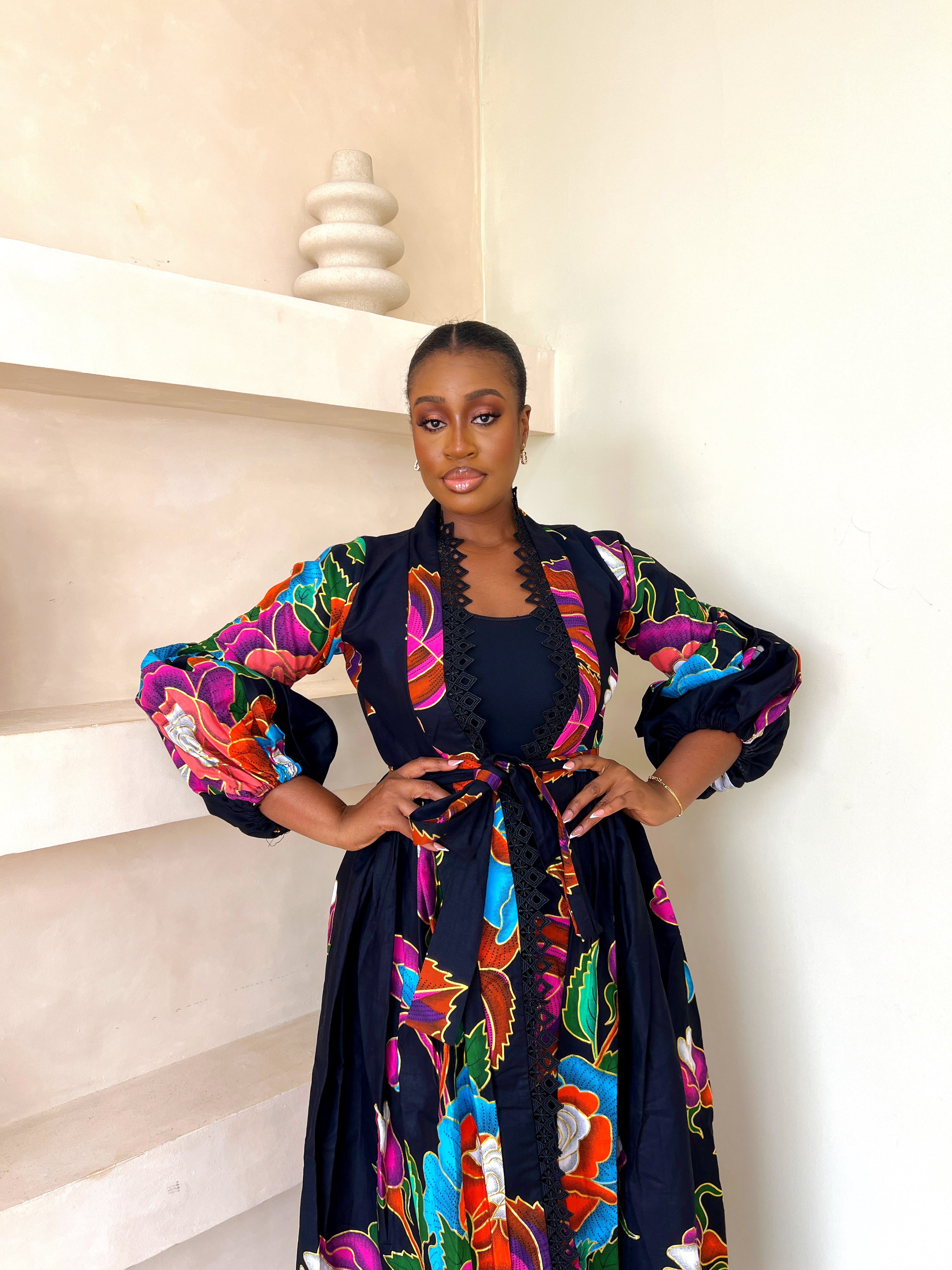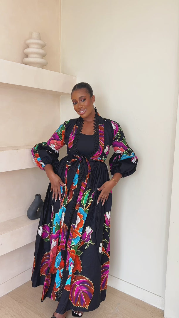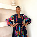 The Koa Kimono in an exotic metallic black, green and blue Ankara floral print. Sultry, stunning, and speaks for itself. Wear it as a kimono Dress, or open with a pair of pants and top. Be ready for all the attention! Look Unique. Know You Are Beautiful.