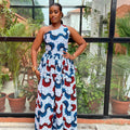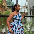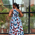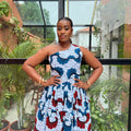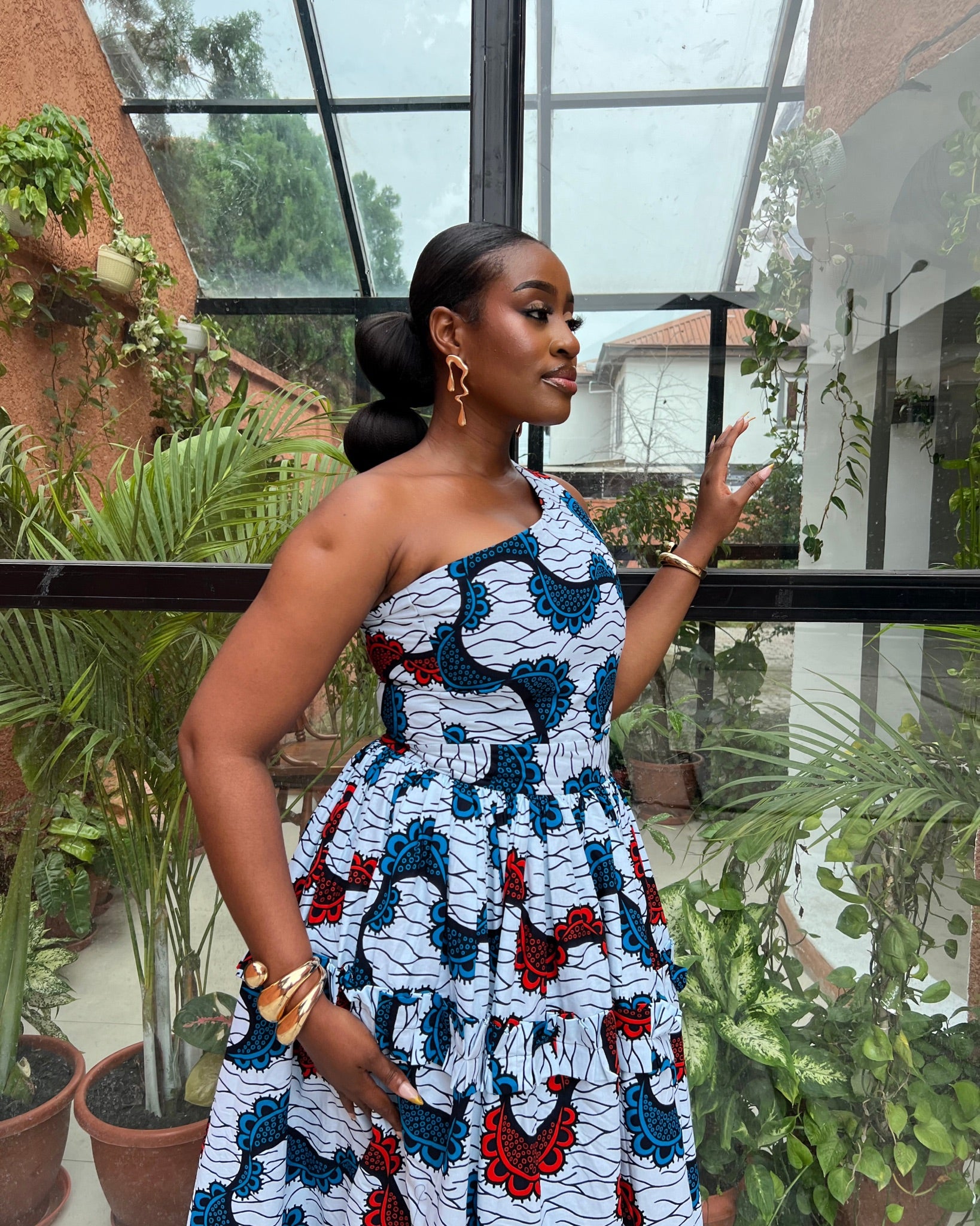 Embrace bold sophistication with the Sarfowaa Maxi Dress. A striking piece for the modern muse who loves to make a statement. Crafted from vibrant Ankara fabric, this one-shoulder maxi dress features a flattering cinched waist, cascading tiers, and a dramatic full skirt that moves beautifully with every step. The unique red and blue wave print on a crisp white base exudes confidence and elegance, making it perfect for weddings, soirées, or elevated everyday glam.