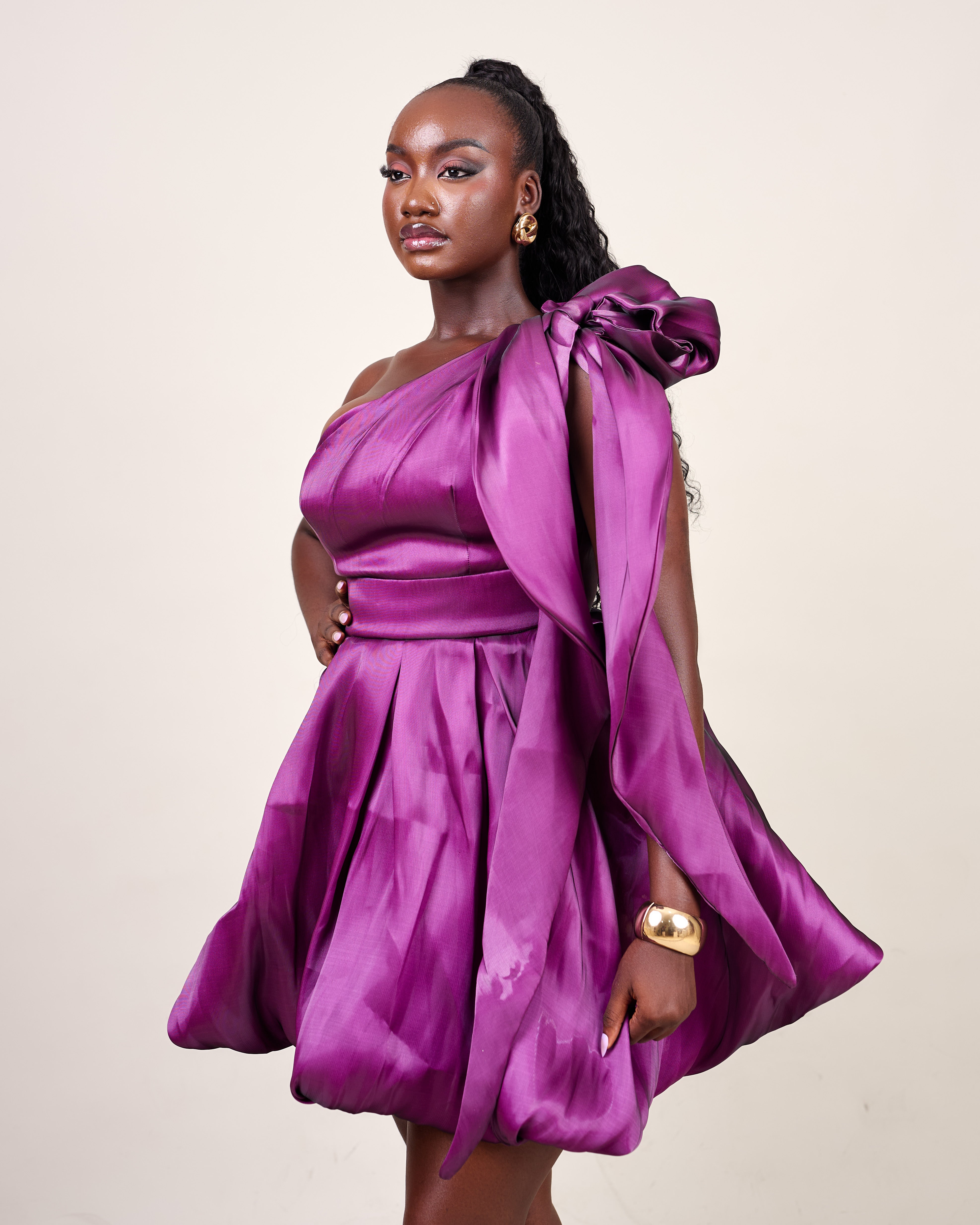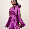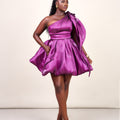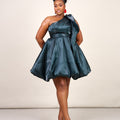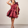 Crafted in luminous liquid organza, this dress features a soft sheen that reflects light beautifully with every step. The one-shoulder silhouette is elevated with a dramatic sculptural bow, while the voluminous bubble mini skirt creates a playful yet refined shape that feels festive without trying too hard.