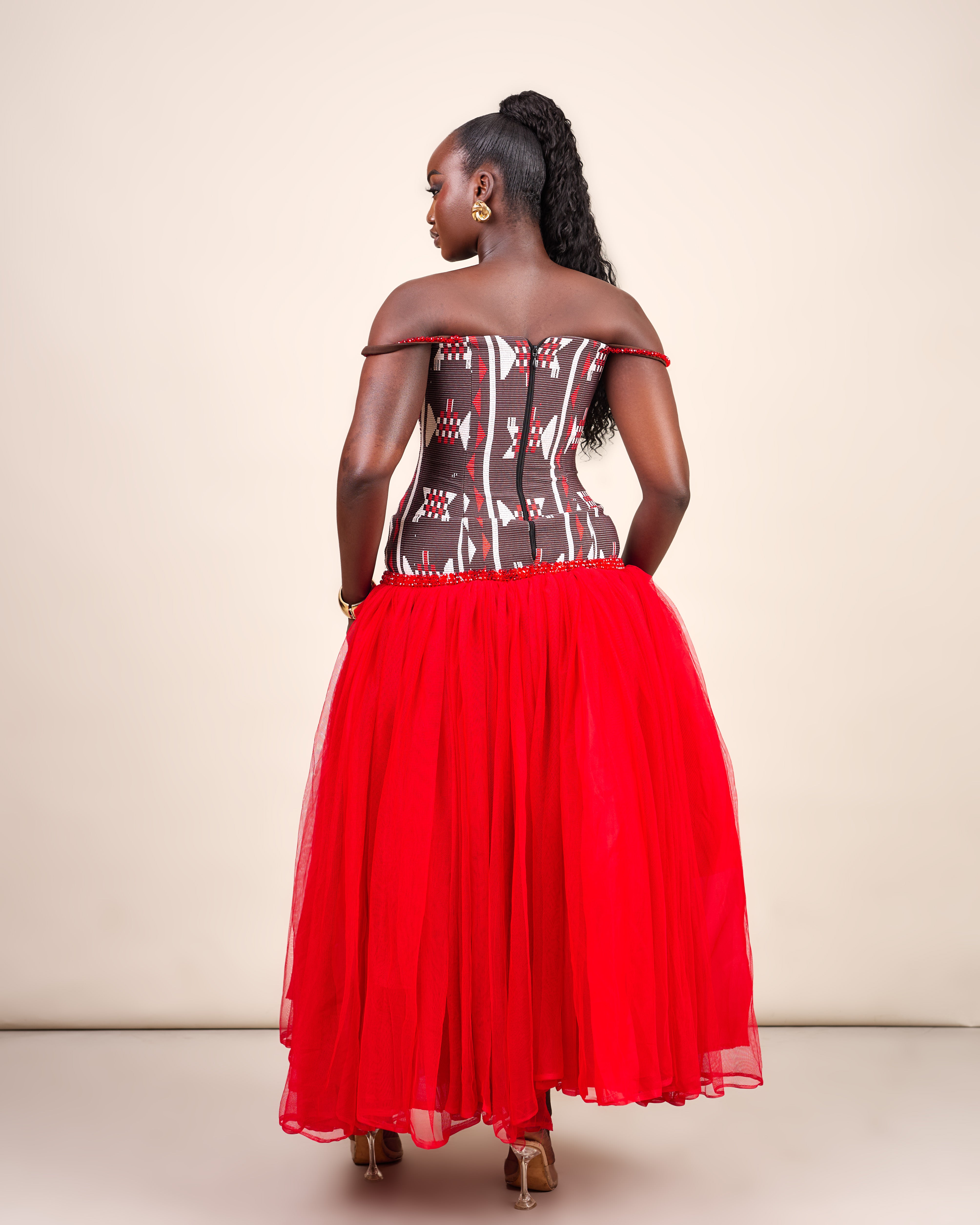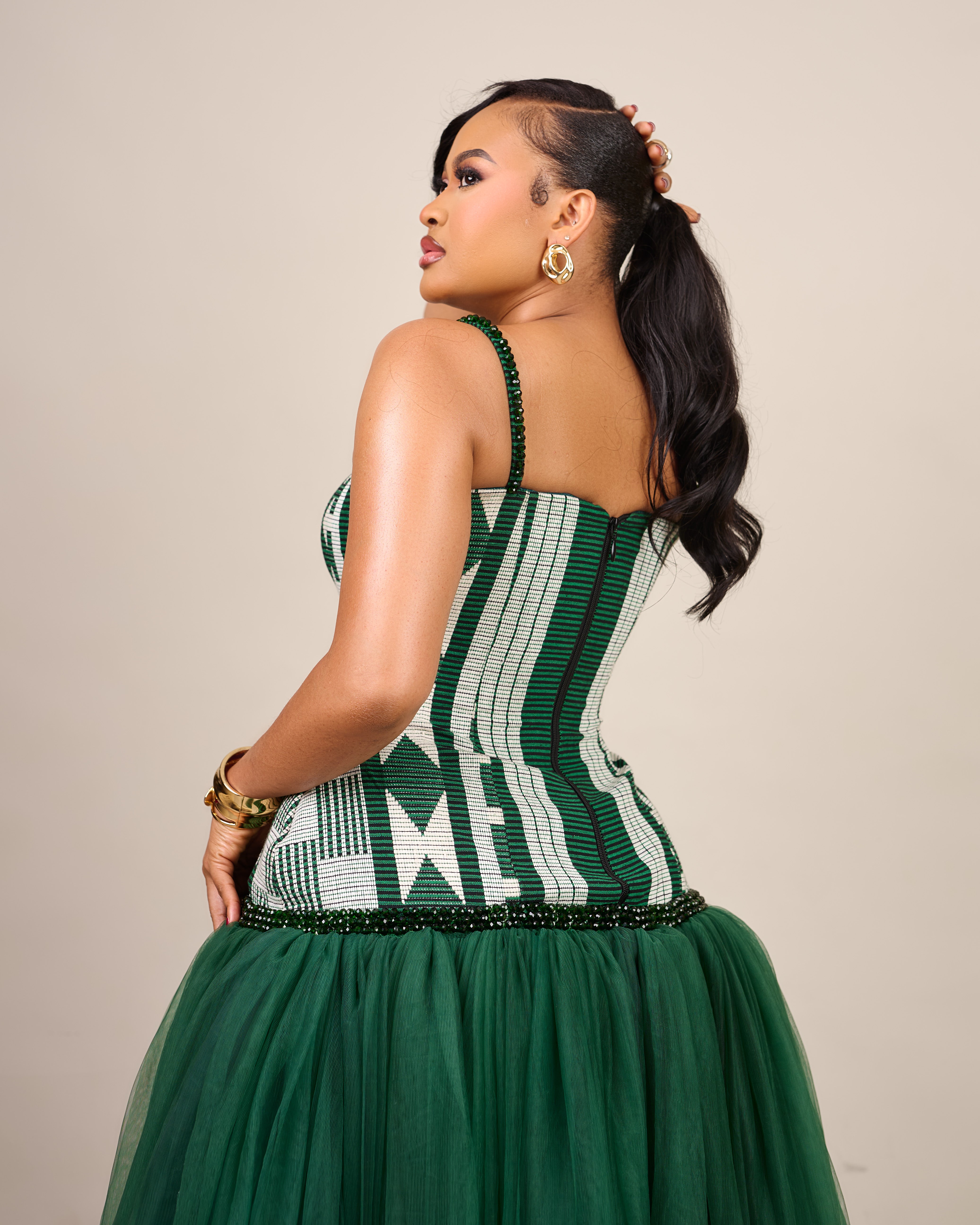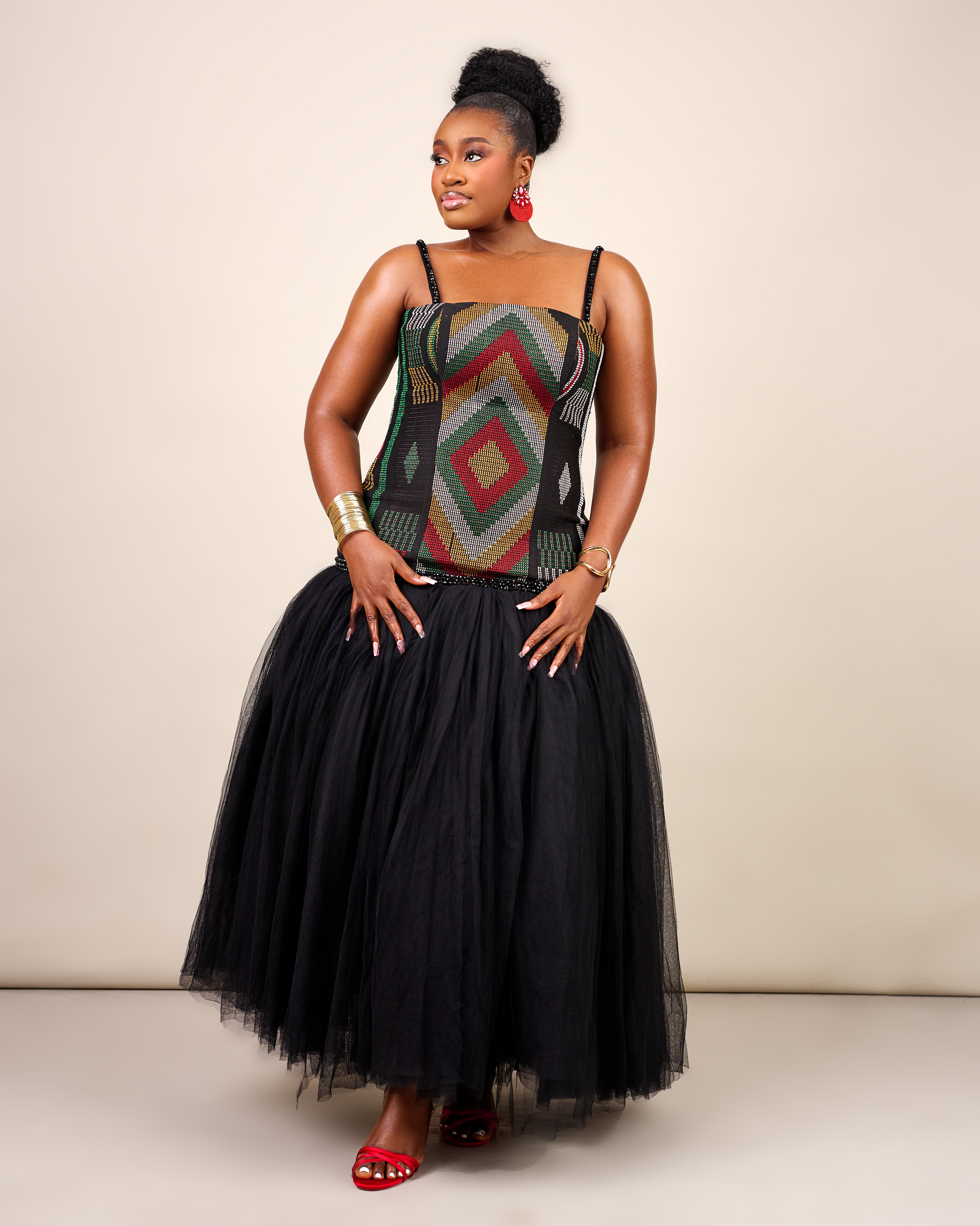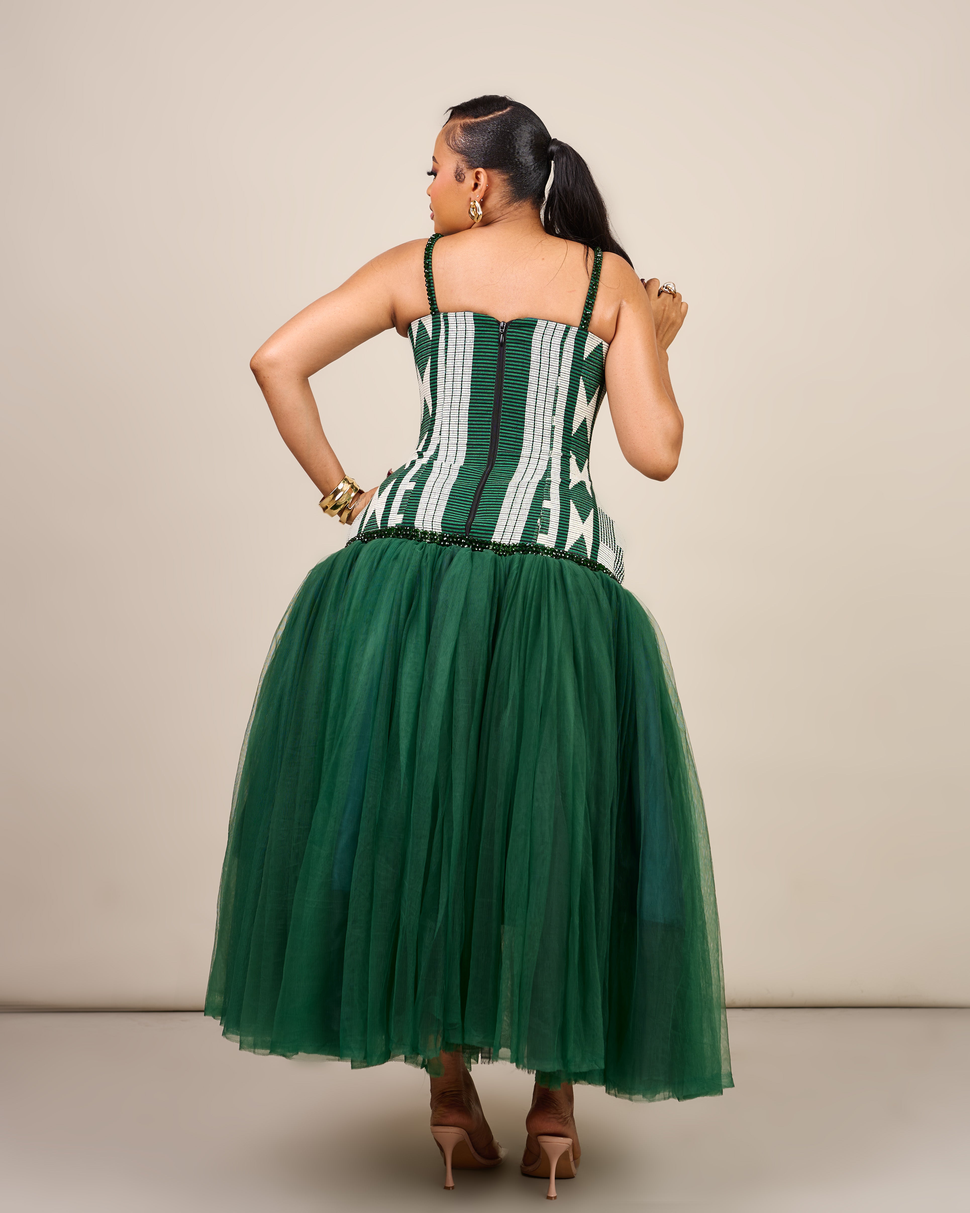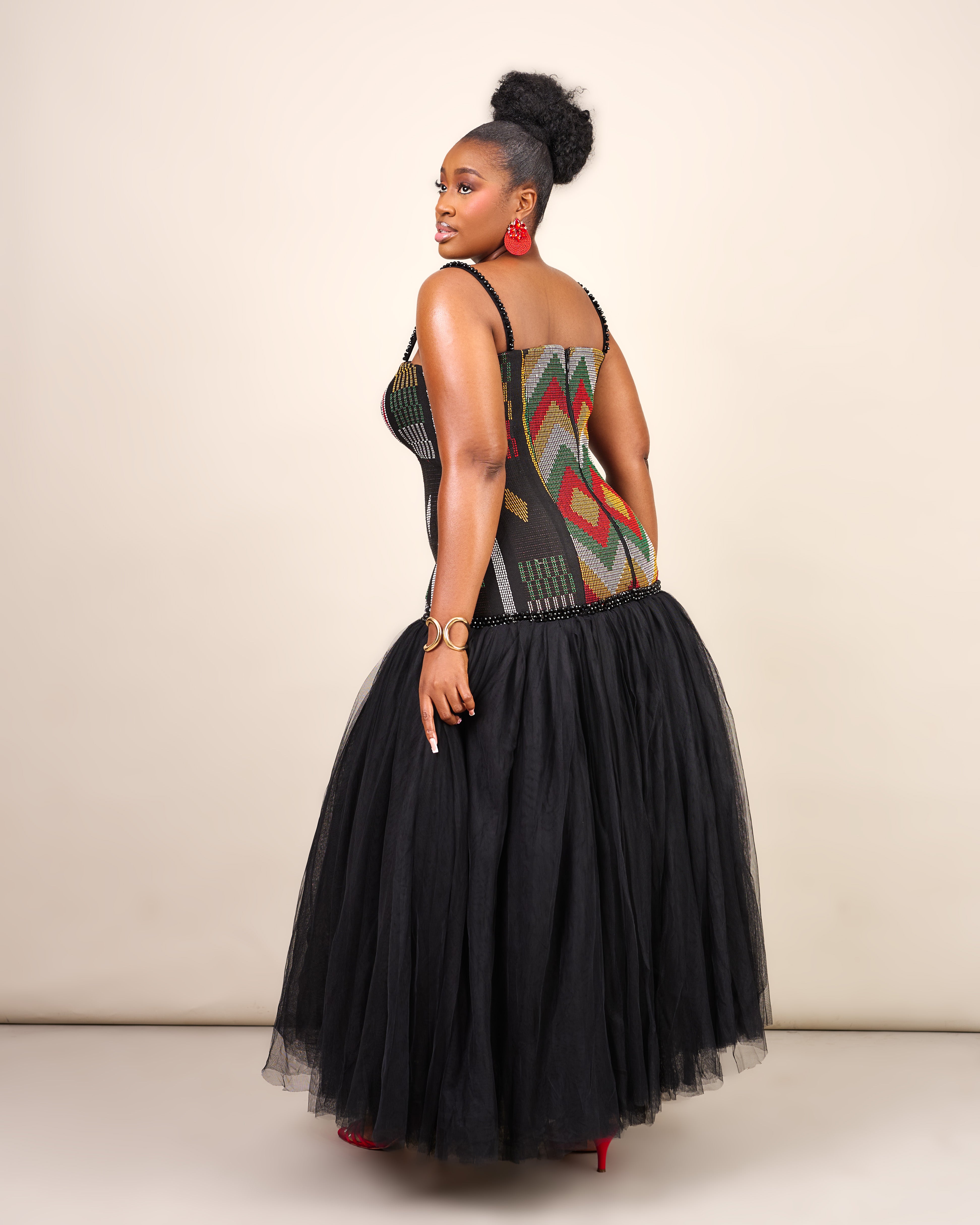 The Sankofa Dress features a handwoven Akwete corset, delicately beaded at the straps and drop waist, flowing into a soft, dramatic tulle skirt. A celebration of tradition, craftsmanship, and luxurious modern femininity.