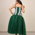 Flowing from the beaded waist is a soft tulle skirt, designed to move effortlessly with every step. Light, airy, and romantic, the tulle creates a striking contrast to the structured woven top - balancing strength and softness in one timeless silhouette.