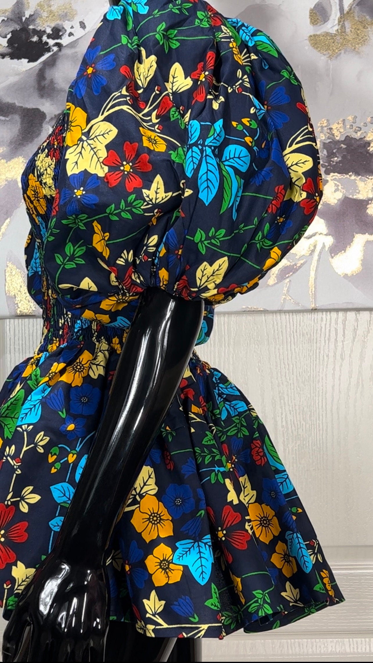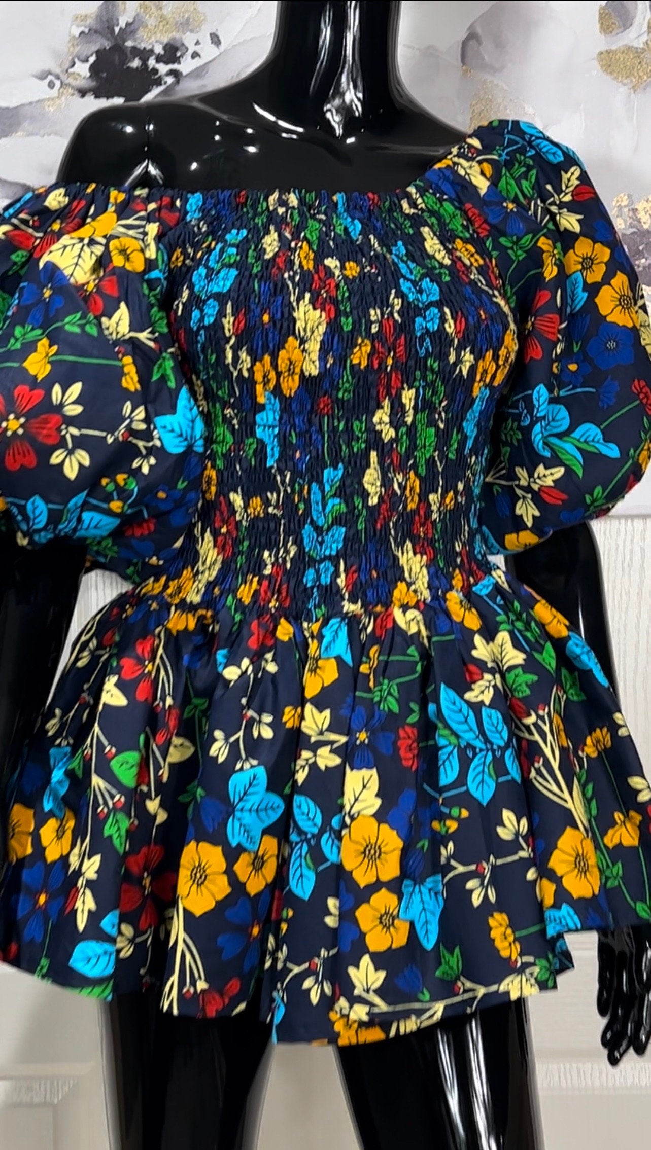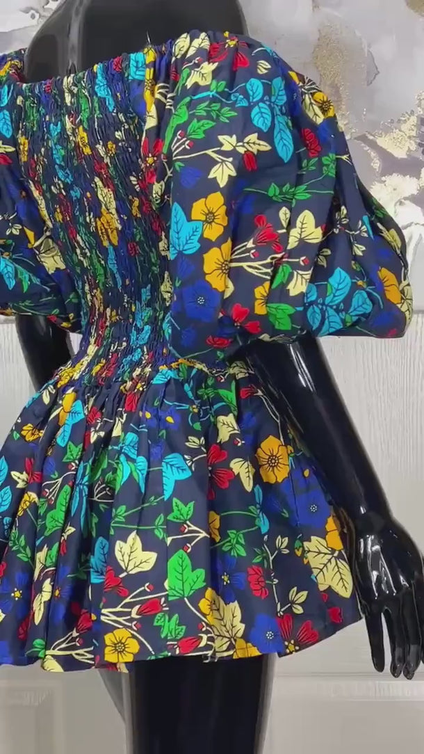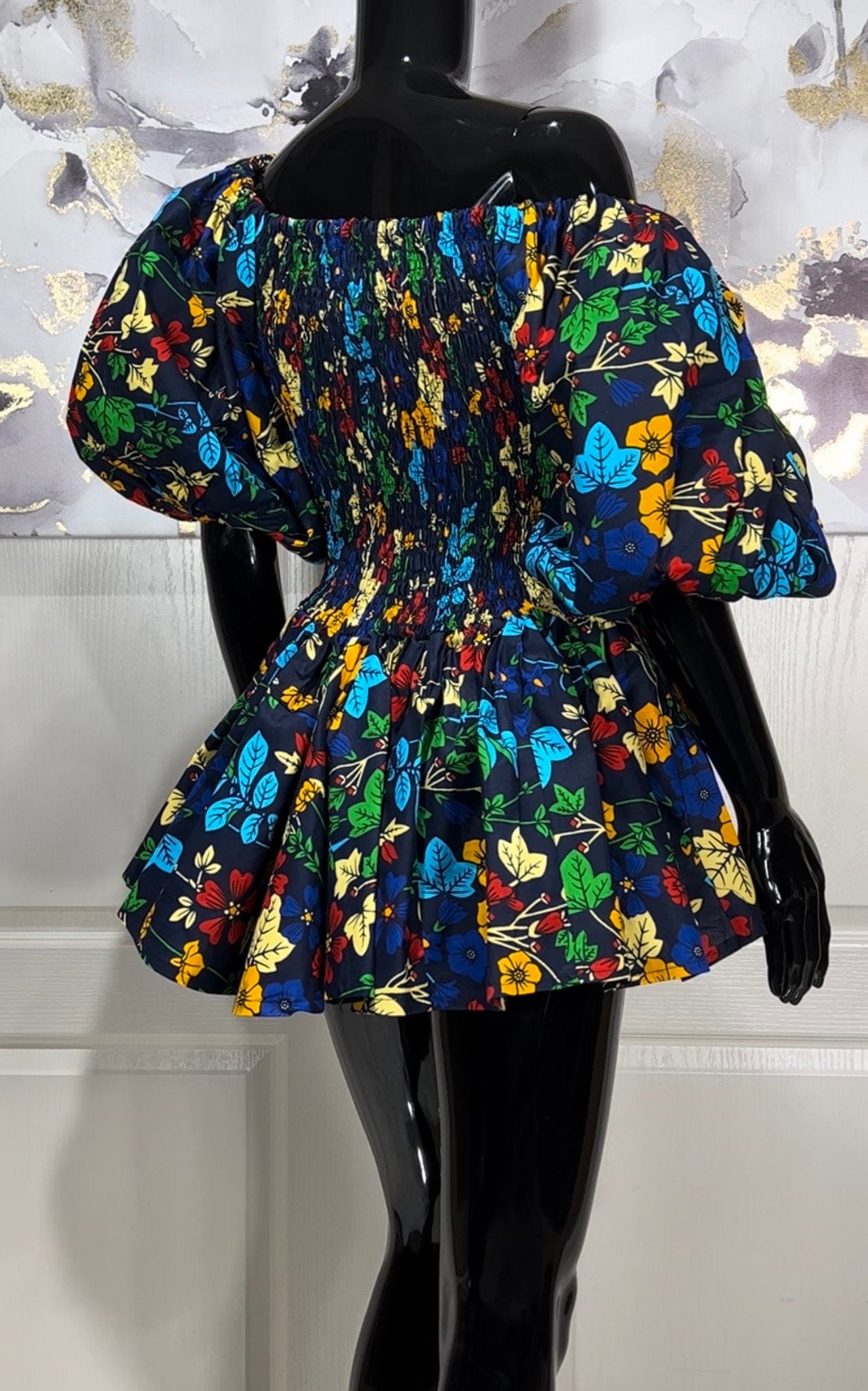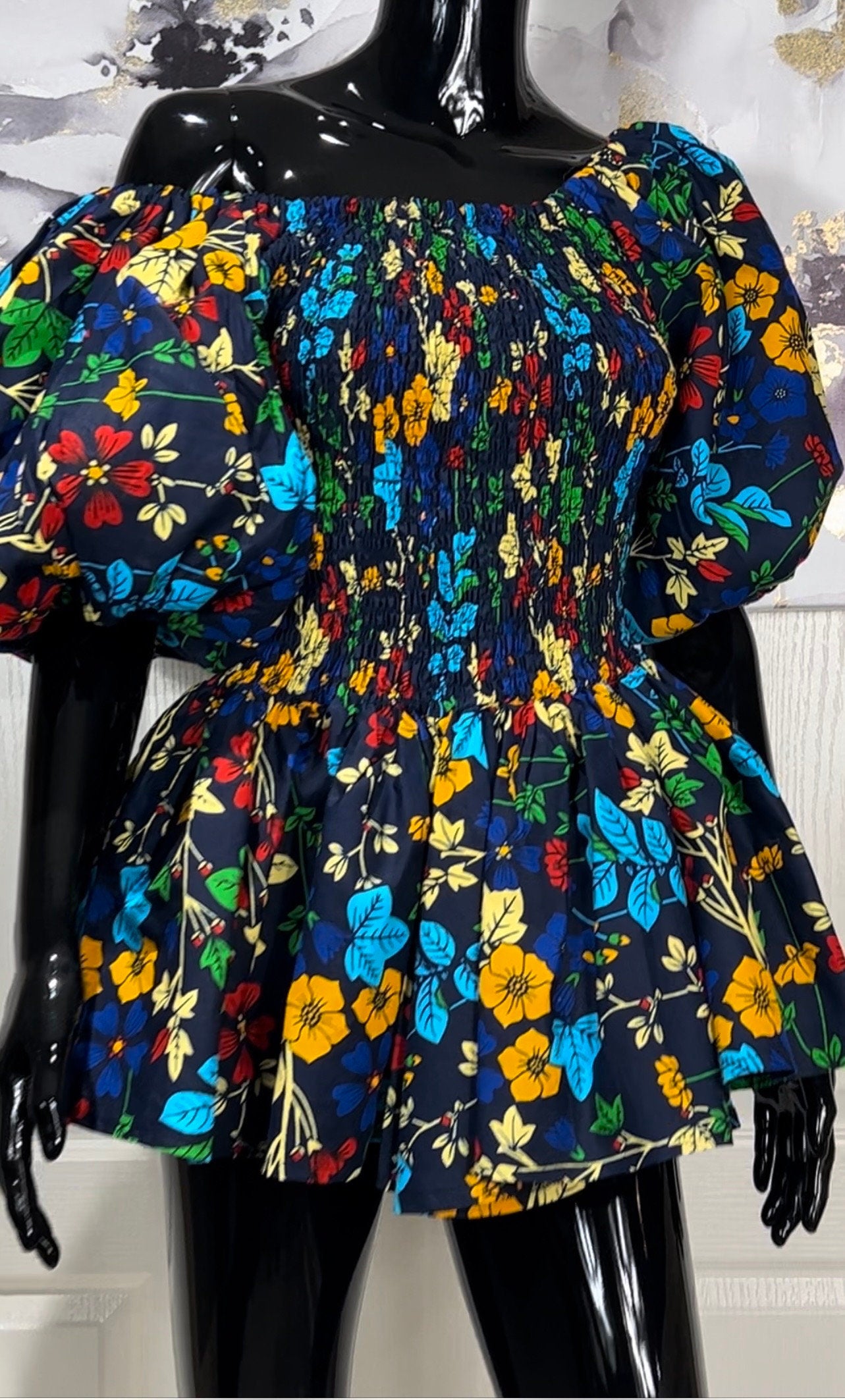 Sassy, Is What Our SAFARA African Print Floral Smocked Top Mini Dress Is. It is a Beautiful And Interesting Versatile Top That Allows You To Bring Your Imagination To Its Styling. However You Wear This, You Will Be Sure To Turn Heads. A Fun Piece For Sure!