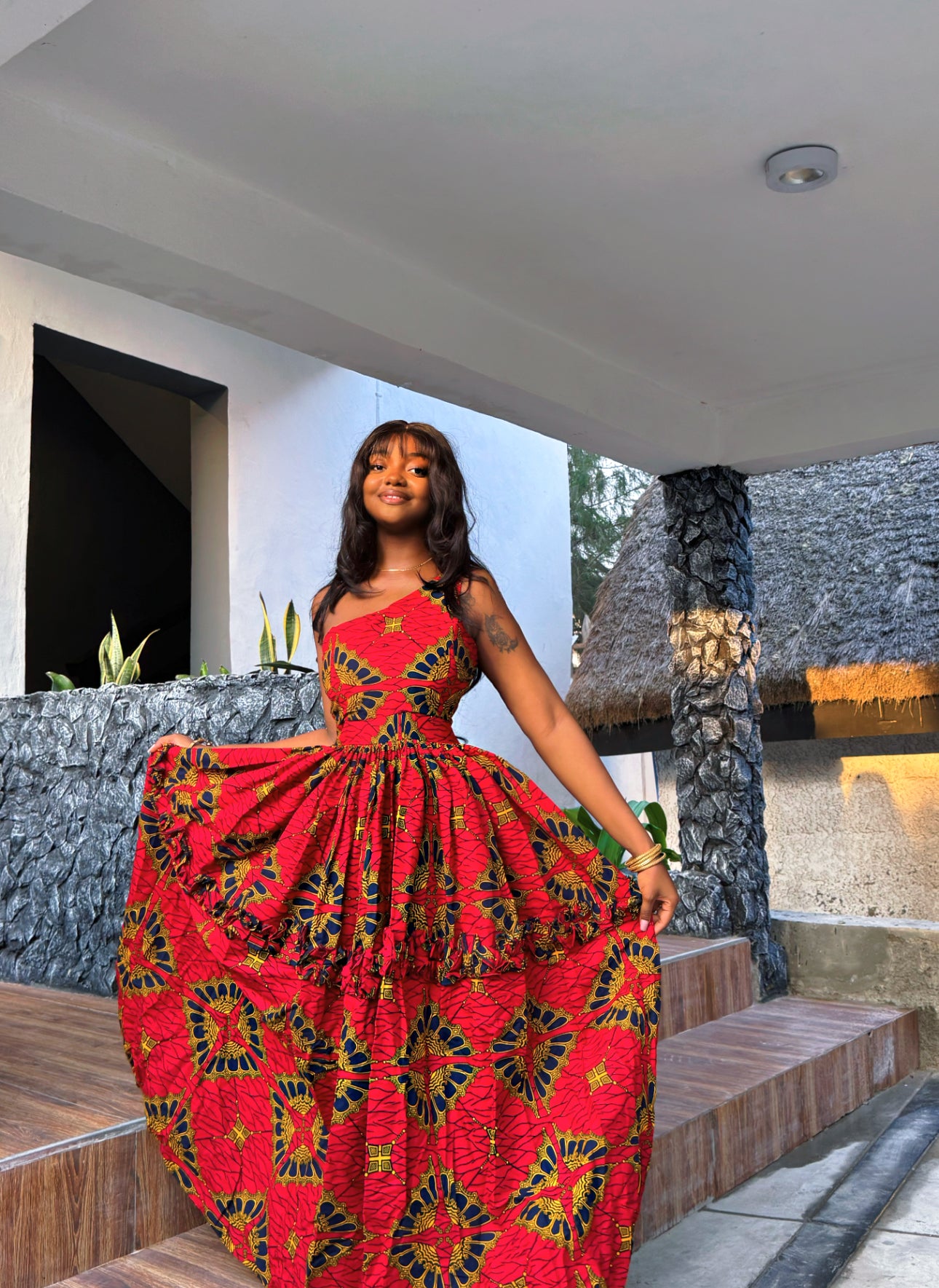 - Style: One-shoulder Ankara maxi dress