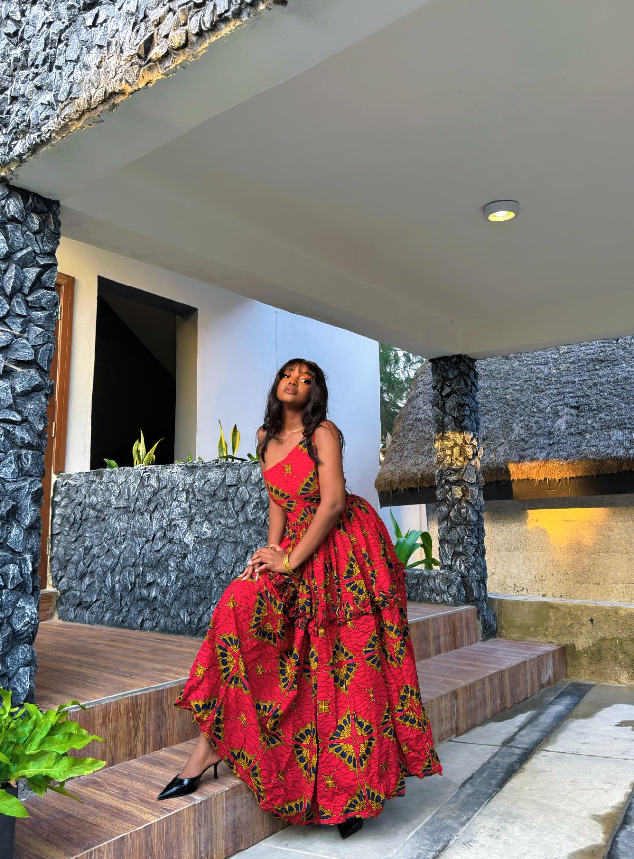 - Bold red, gold, and black African print