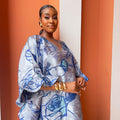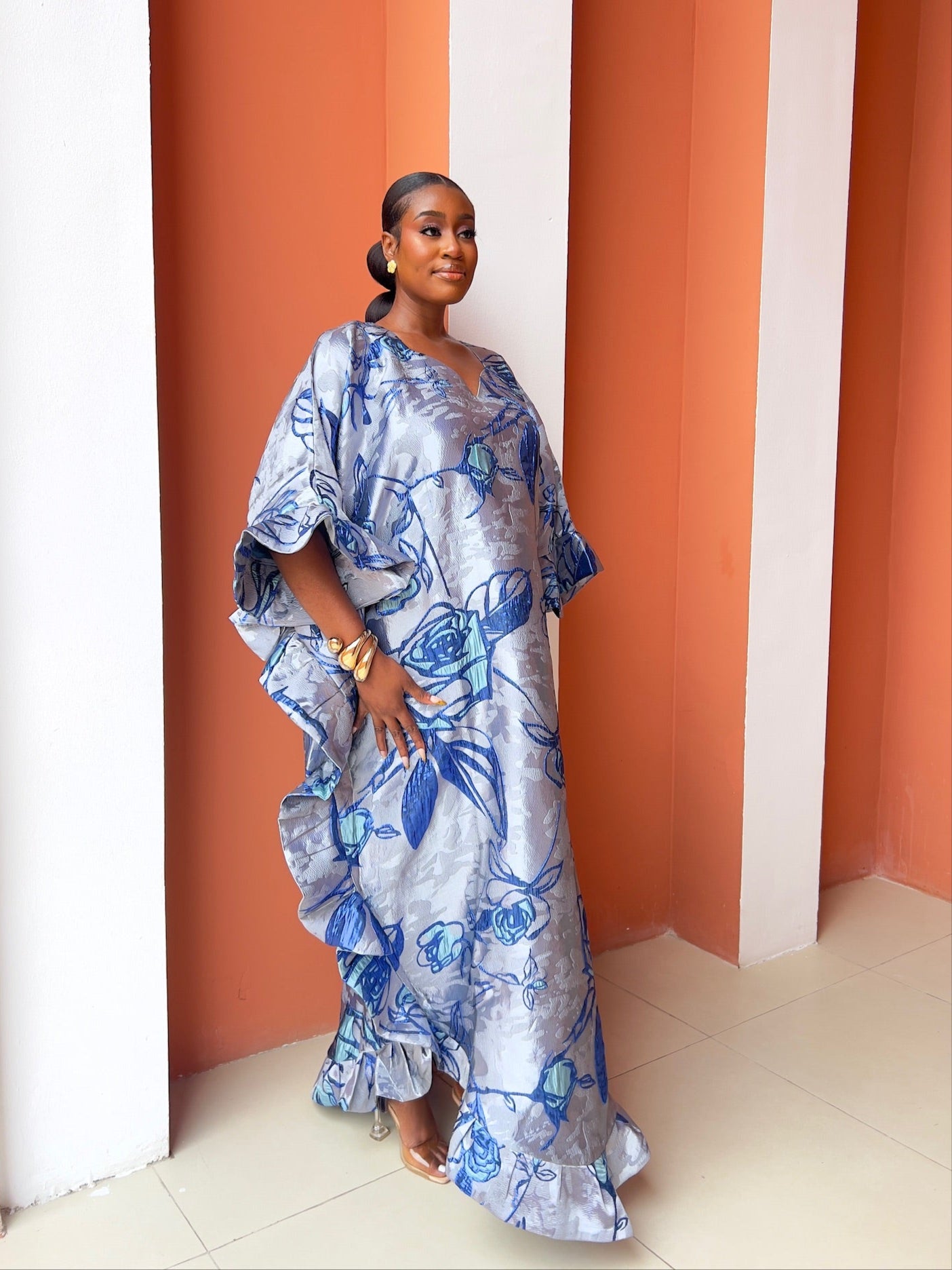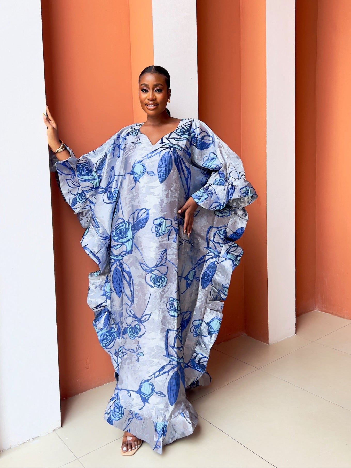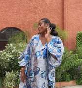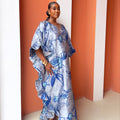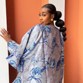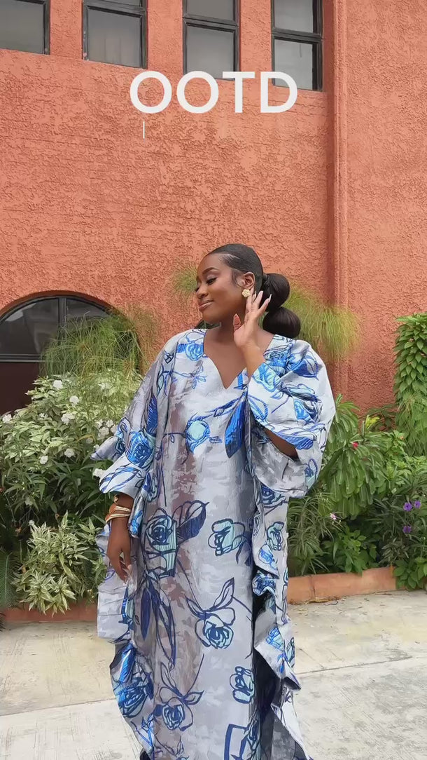 Step into pure elegance with the luxury Marie Kaftan Boubou, made in dreamy symphony of deep indigo, vivid cobalt, powder blue and silver floral premium jacquard brocade, a painterly combination that feels fresh, yet timeless, together creating a mesmerizing, almost watercolor effect that shifts beautifully as you move. This flowing masterpiece is designed for the woman who wants to look effortlessly regal while staying completely comfortable, luxury handcrafted by skilled artisans, celebrating African heritage through exceptional craftsmanship and attention to detail.