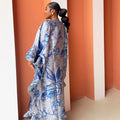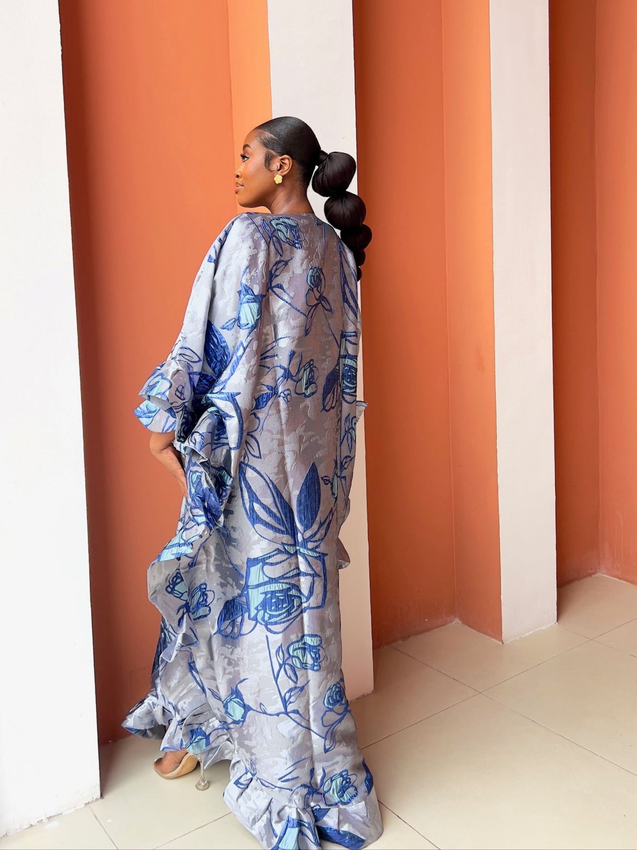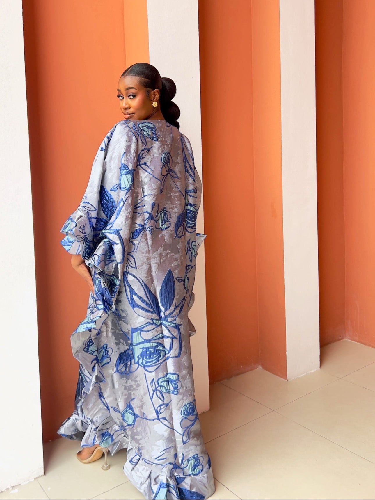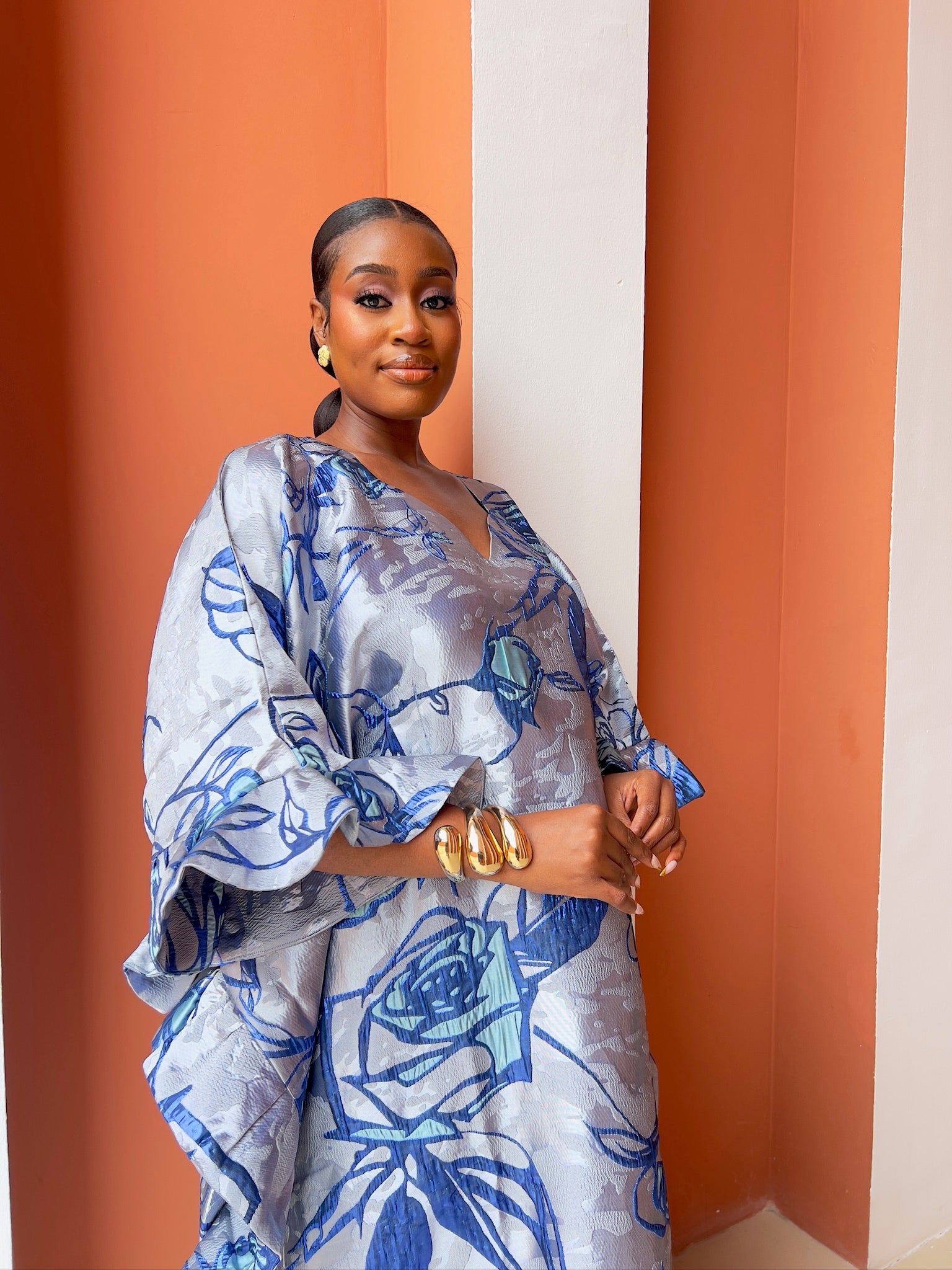 Step into pure elegance with the luxury Marie Kaftan Boubou, made in dreamy symphony of deep indigo, vivid cobalt, powder blue and silver floral premium jacquard brocade, a painterly combination that feels fresh, yet timeless, together creating a mesmerizing, almost watercolor effect that shifts beautifully as you move. This flowing masterpiece is designed for the woman who wants to look effortlessly regal while staying completely comfortable, luxury handcrafted by skilled artisans, celebrating African heritage through exceptional craftsmanship and attention to detail.