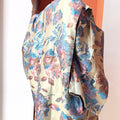 This statement piece features a subtle pastel base with intricate pink and blue floral accents which brings an air of femininity and grace, while the wide layered sleeves add a regal touch, creating an aura of grandeur.