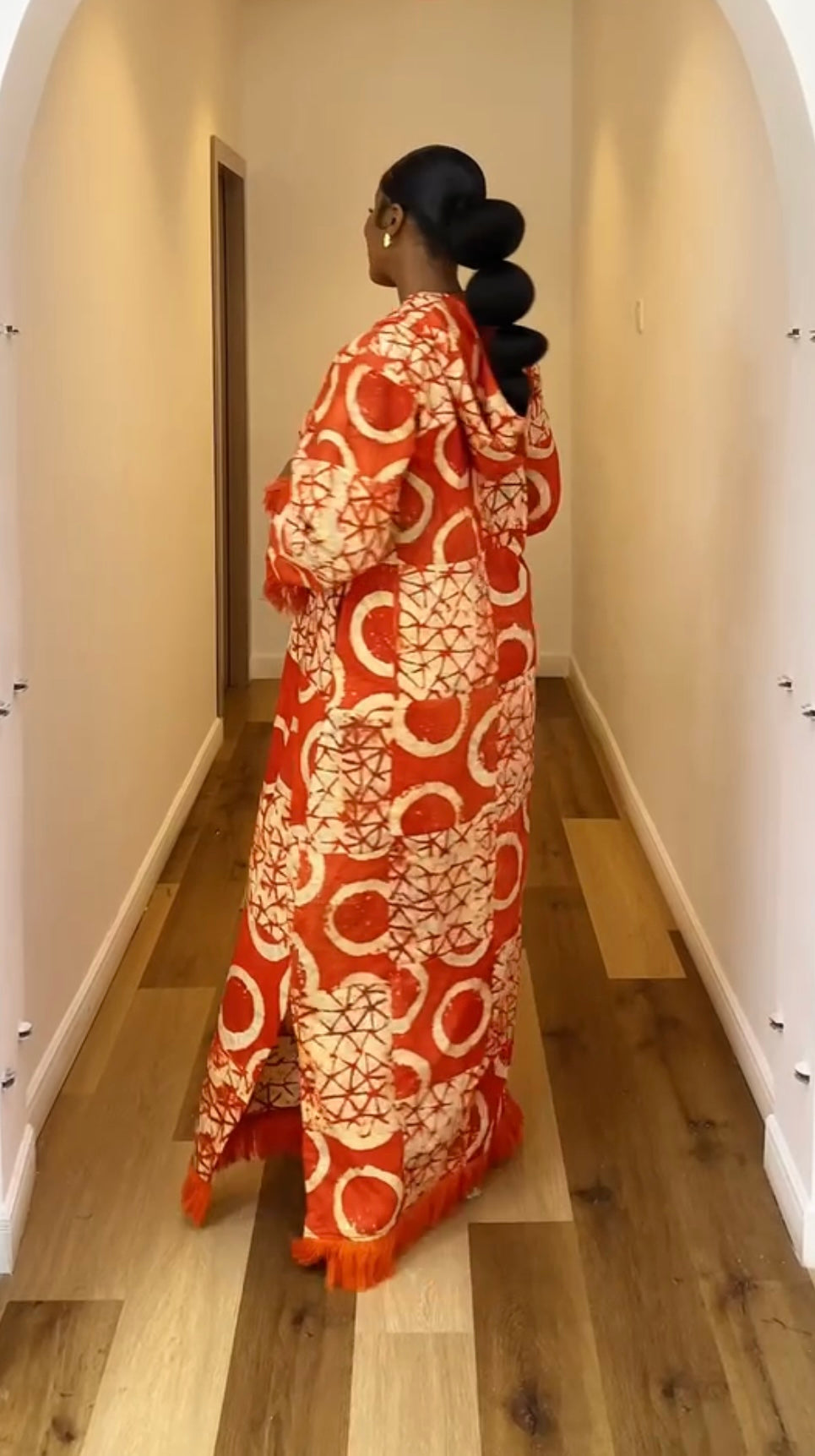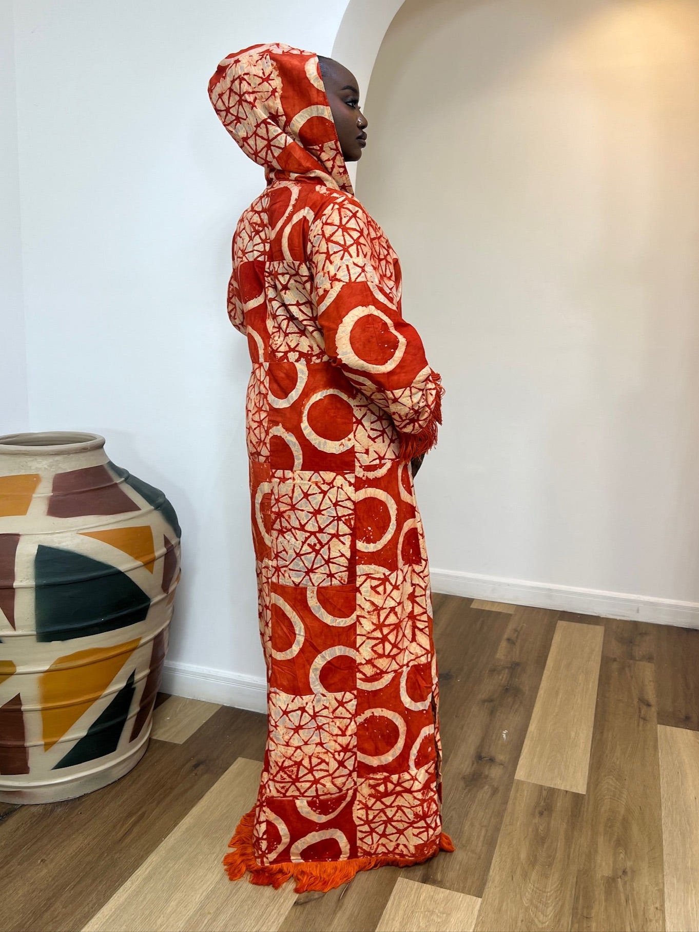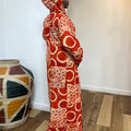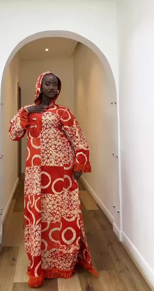 Bring the brilliance of African artistry into your wardrobe with the Adire Patch Kaftan in Sunset Flame. Hand-dyed in a striking blend of fiery red and crisp white, this kaftan radiates energy, elegance, and cultural pride.