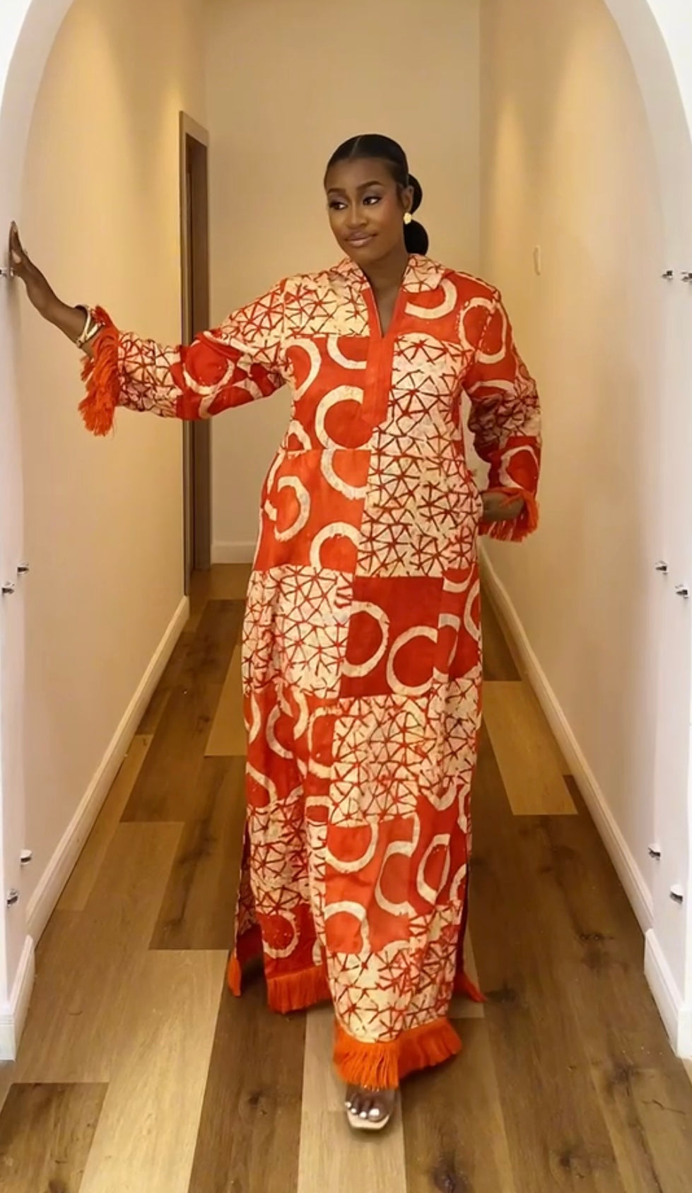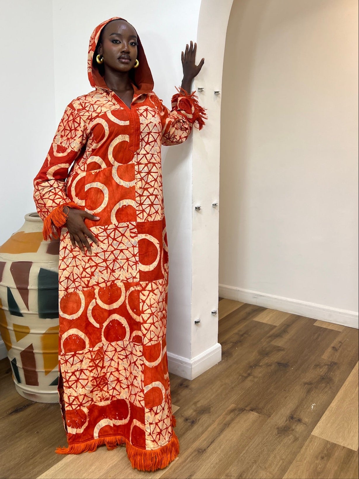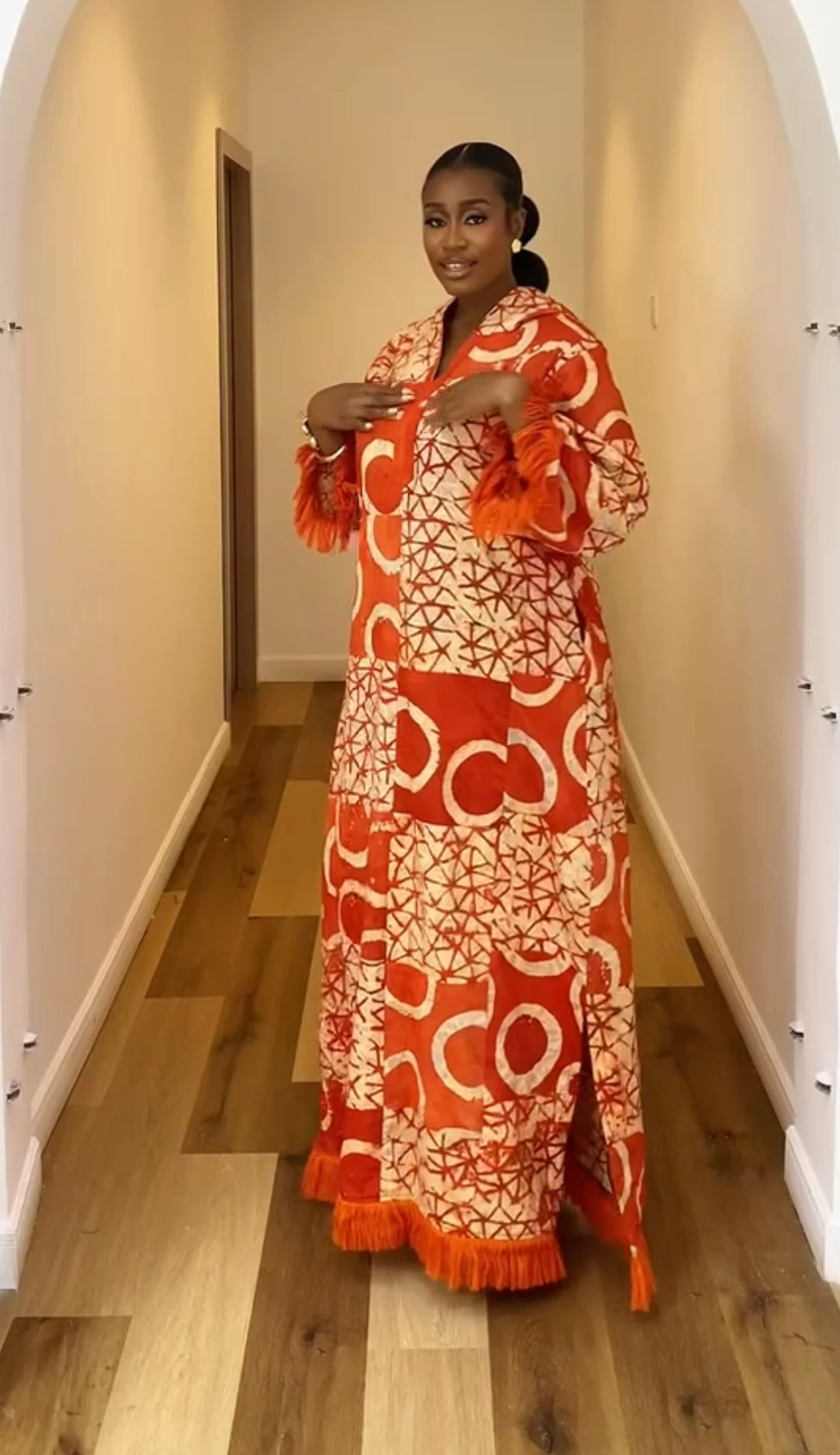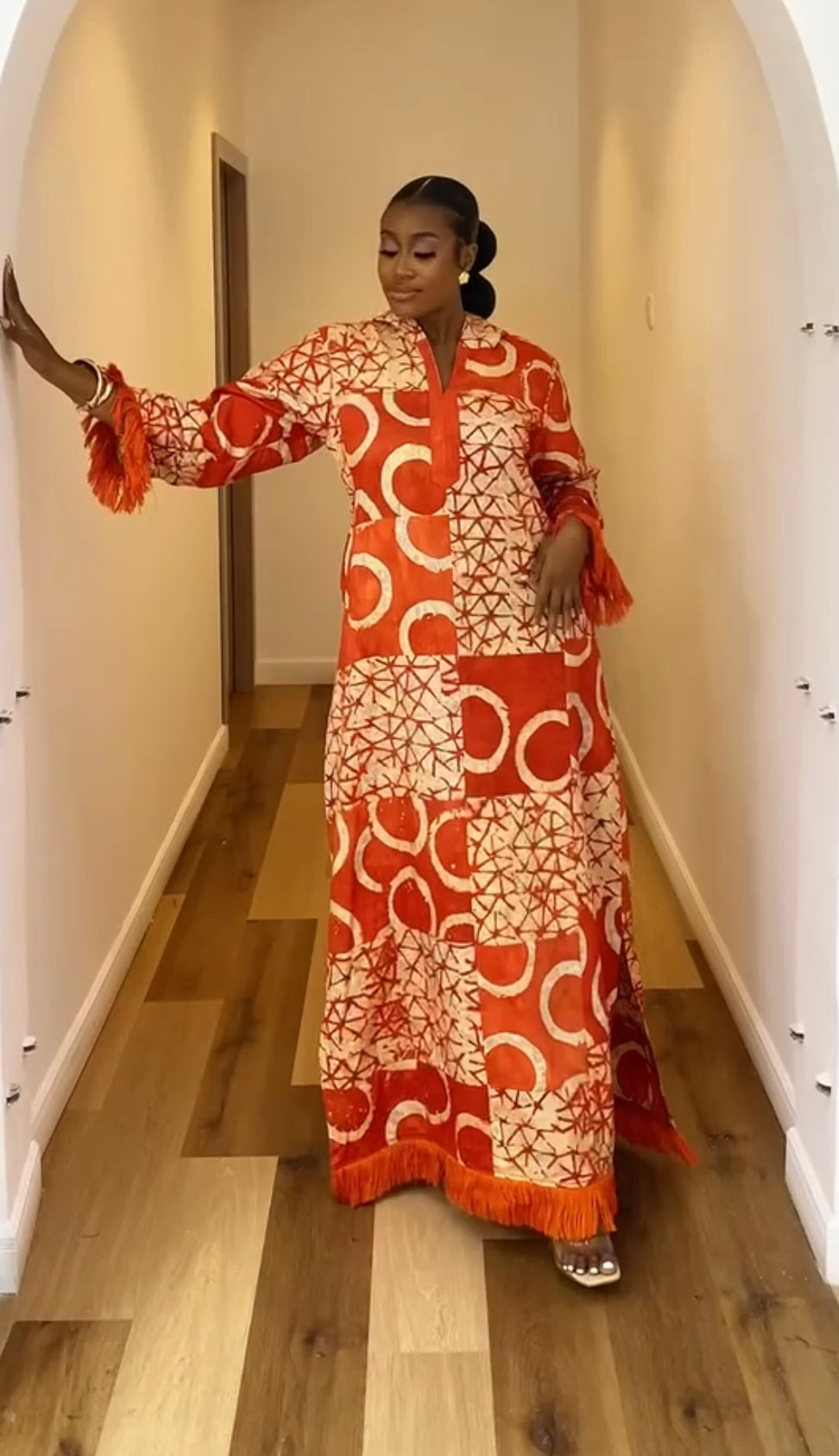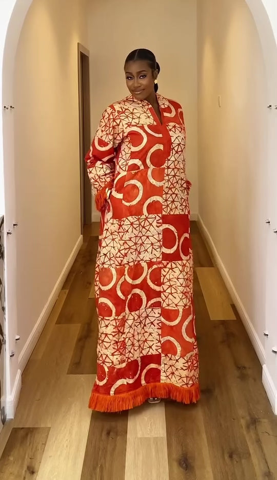 SIKA ADIRE PATCH KAFTAN - SUNSET FLAME WITH ASO OKE FRINGE - LUXE AFRICAN MAXI