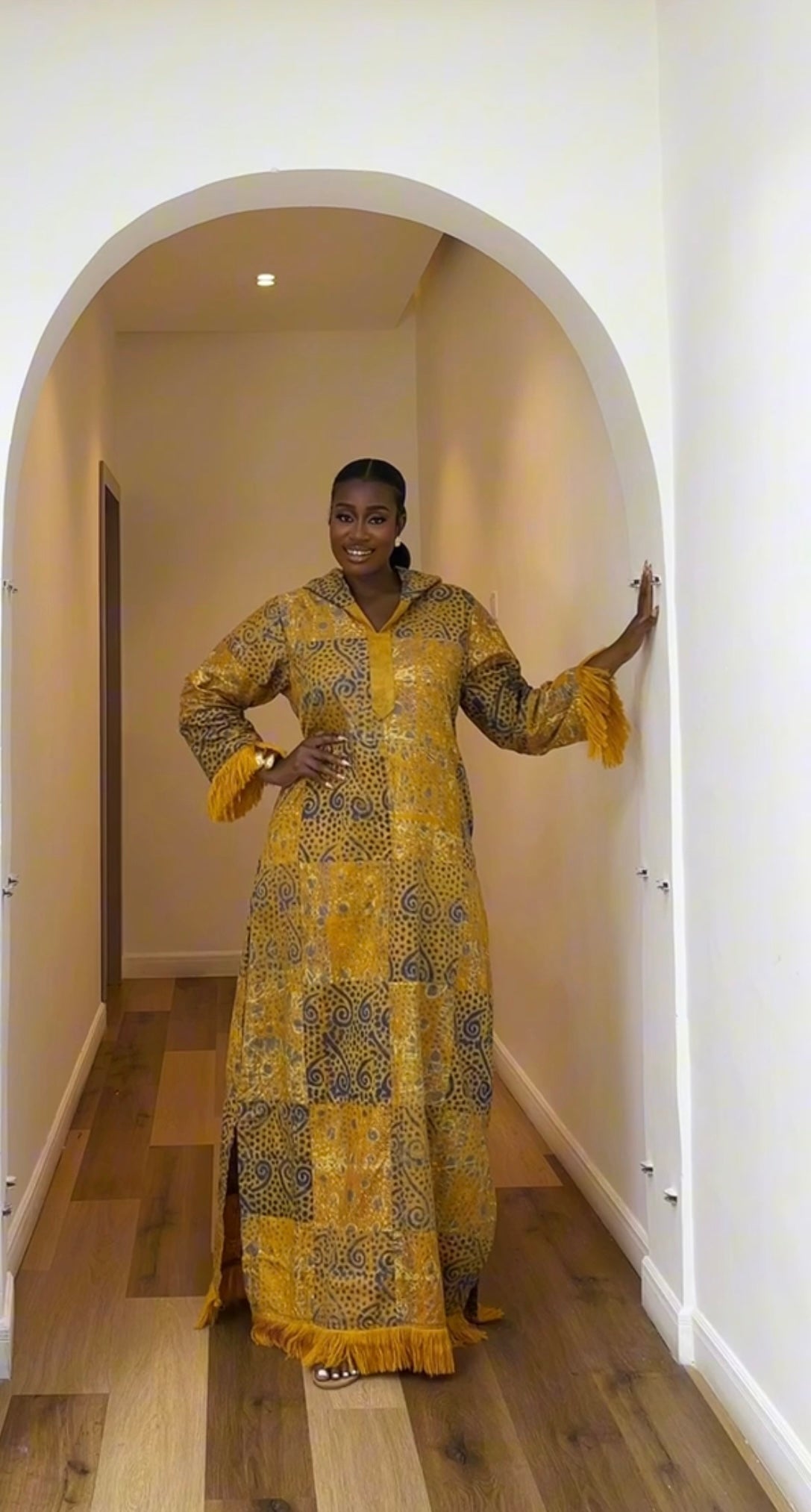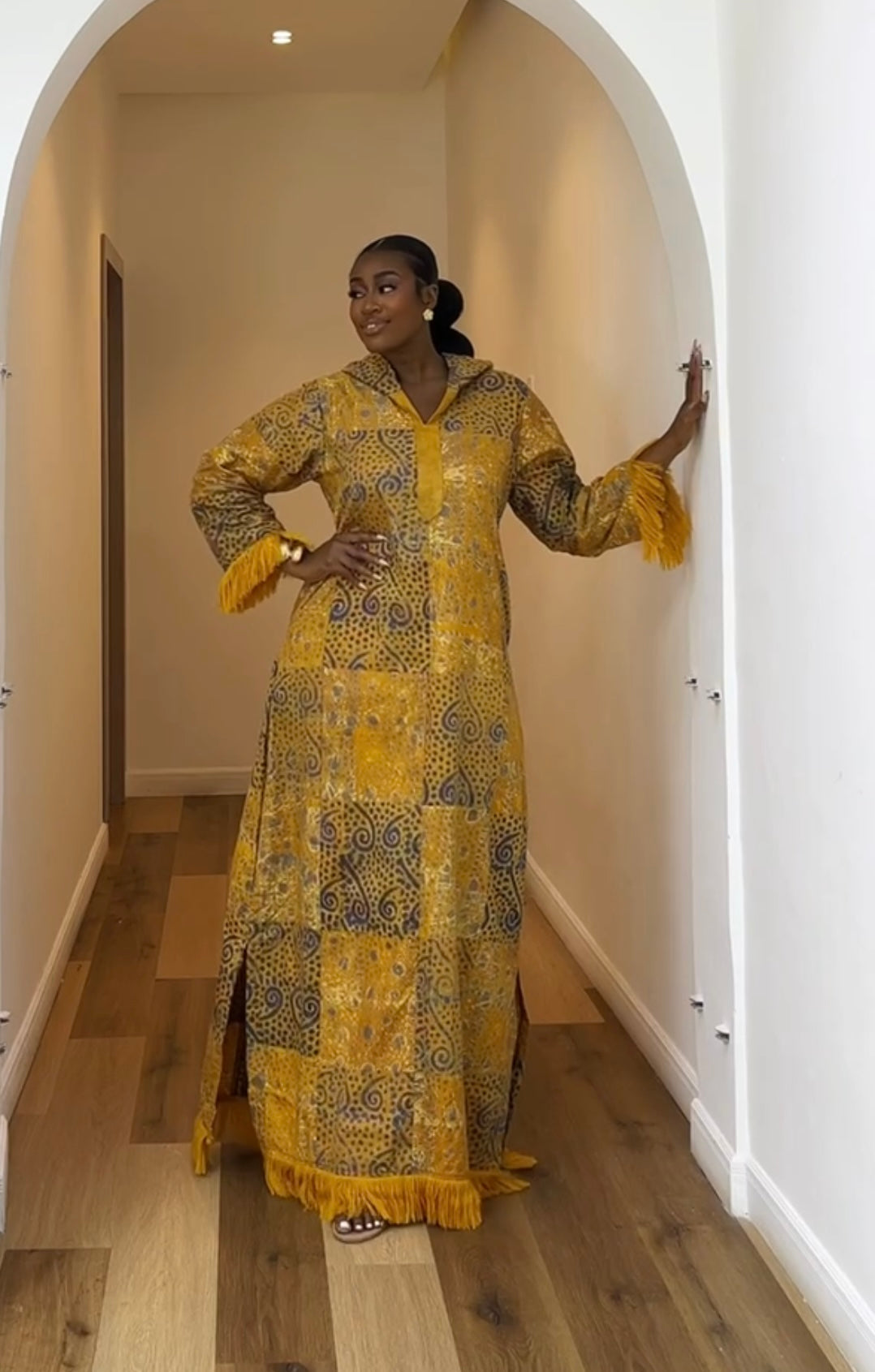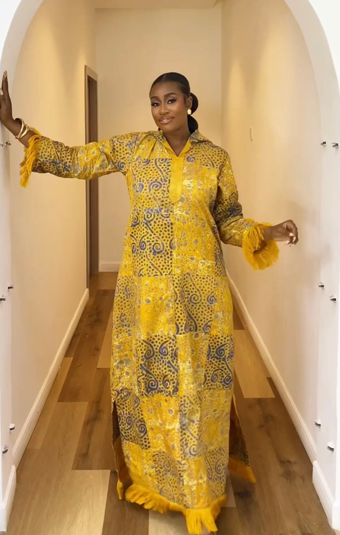 SIKA GOLDEN ADIRE PATCH KAFTAN WITH ASOKE FRINGE - LUXE AFRICAN MAXI