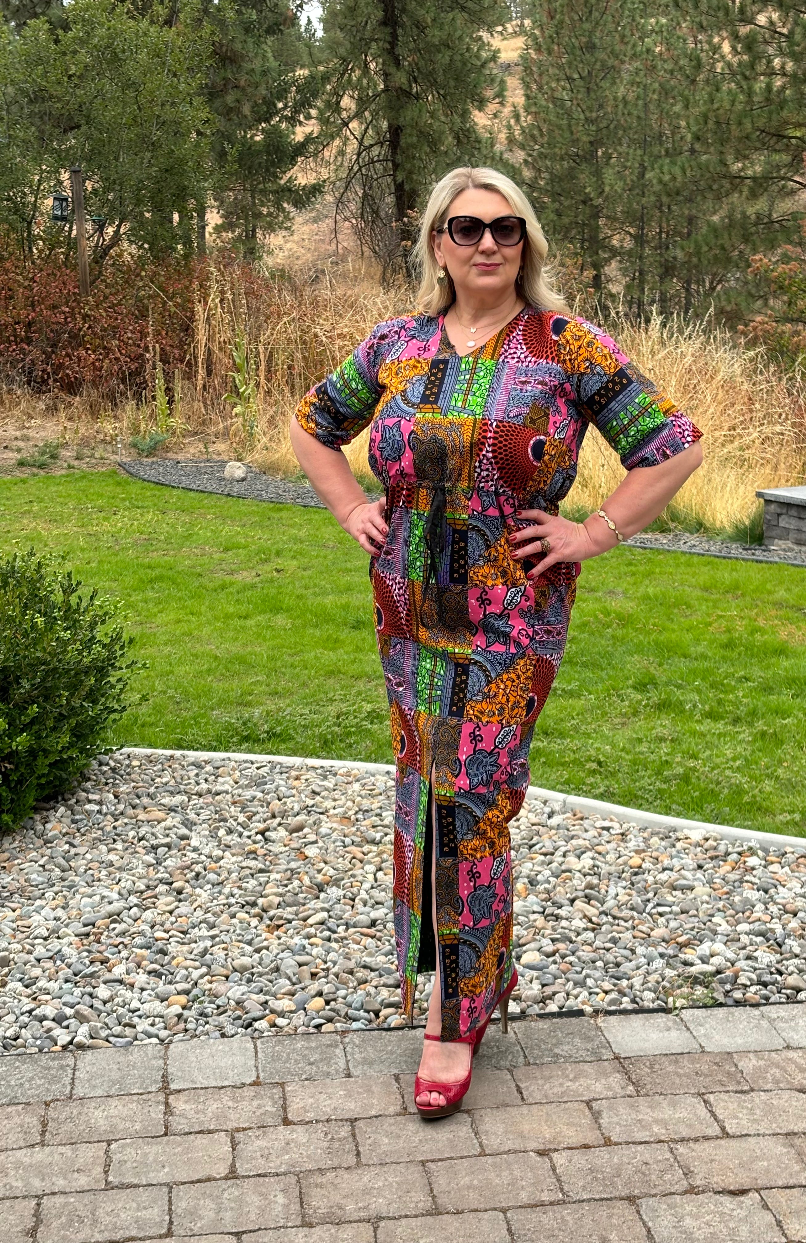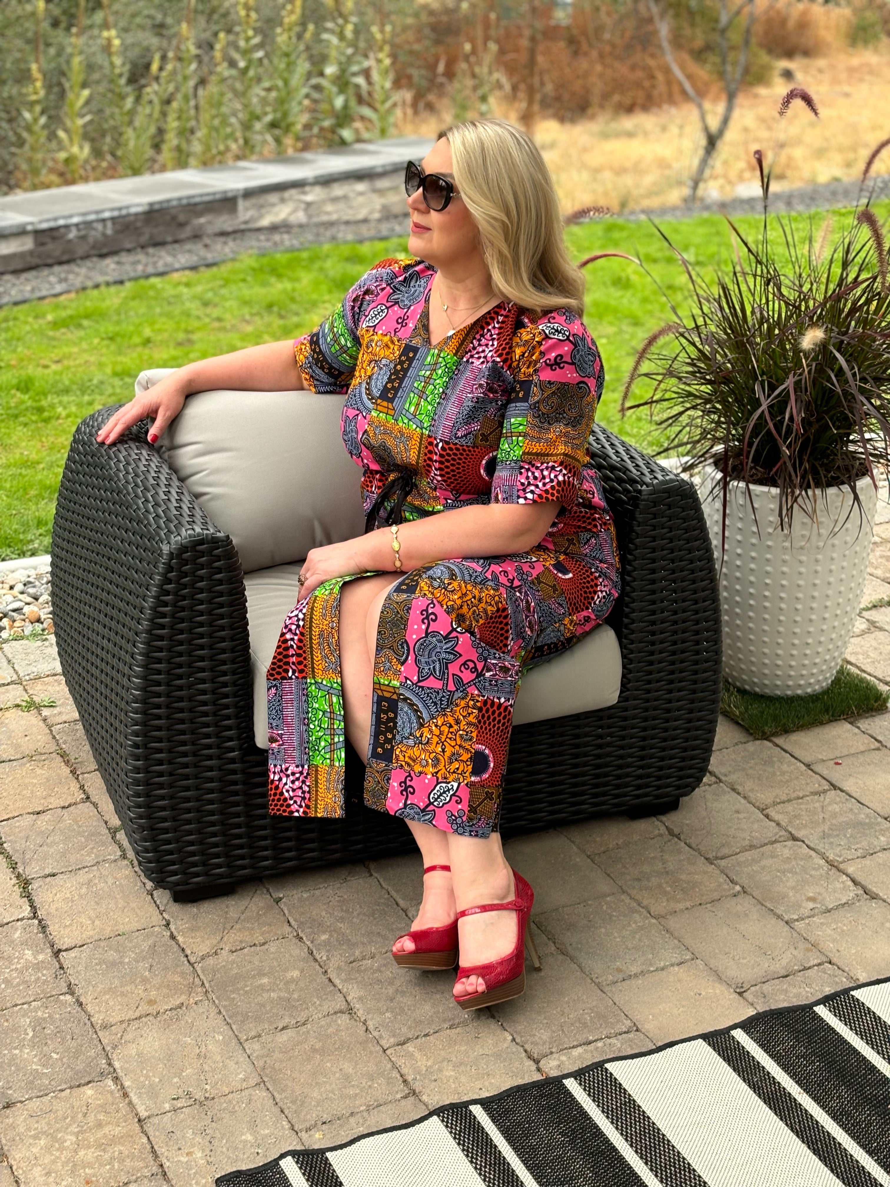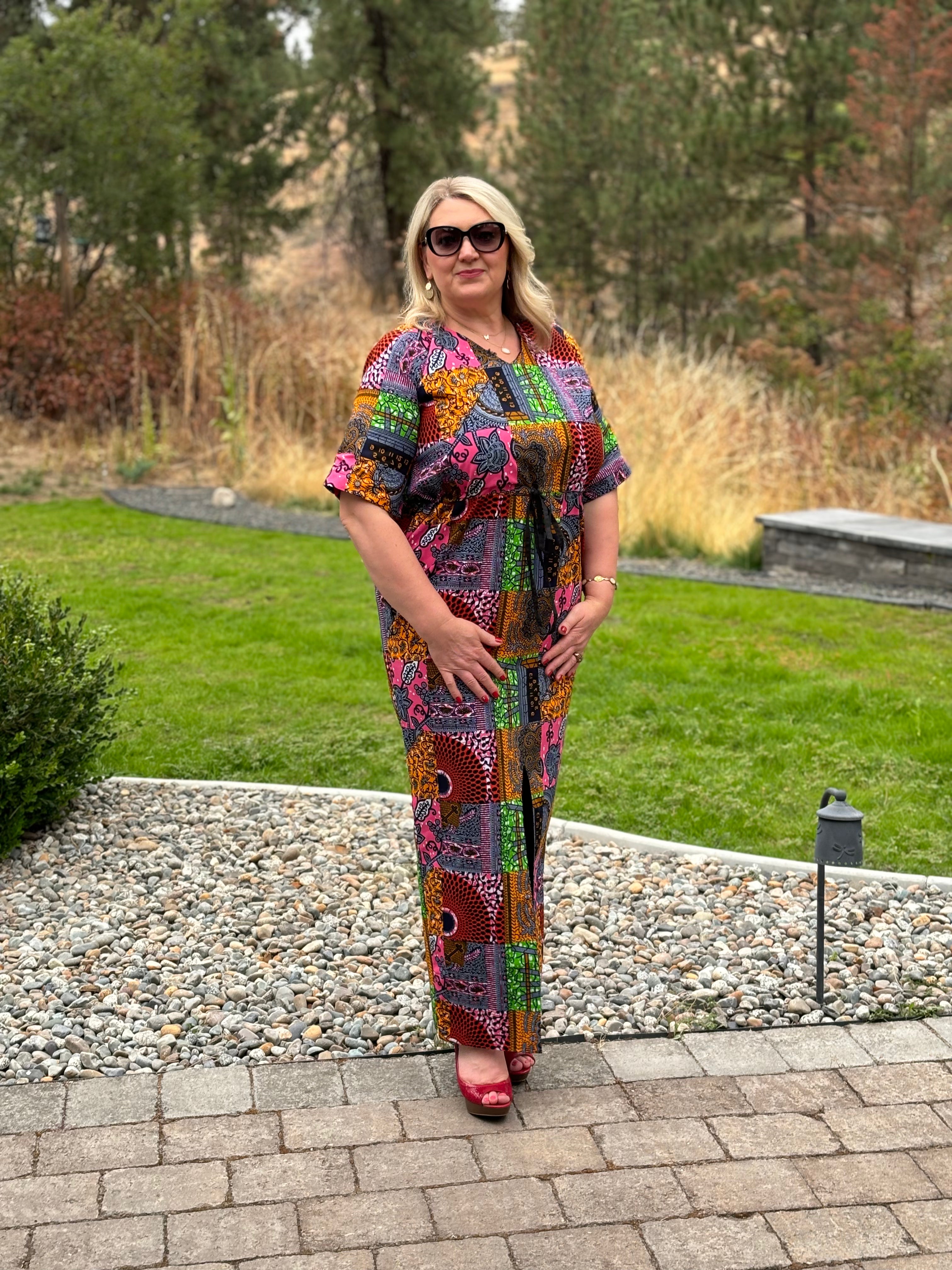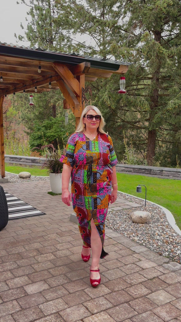 It's In The Patchwork With SIKI. A Unique African Ankara Wax Print Made In An Effortless And Laid Back Maxi Style. A Beautiful Long Dress With A Front Slit That Can Be Dressed Up Or Worn Casually.